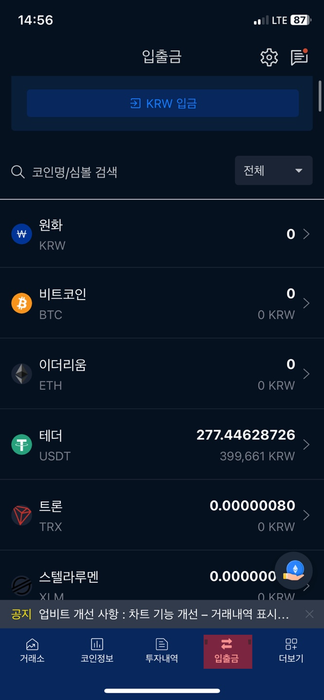 로그인 후, 하단 메뉴에서 '입출금' 탭을 선택해 주세요. 여기서 전송하고자 하는 암호화폐를 선택할 수 있어요.