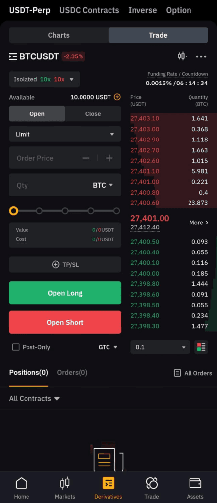 예를 들어, 비트코인의 현재 가격이 27,401.00 USDT라고 가정해볼게요.